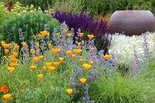 Το μπλε χρώμα ενώ αποτελεί από μόνο του μία ιδιαίτερη κατηγορία χρωματισμού για τον κήπο, παράλληλα αναδεικνύει τα υπόλοιπα χρώματα όπως το κίτρινο, κόκκινο, το λευκό, το μωβ κ.α. Τα φυτά με το μπλε χρώμα συνηθίζεται να χρησιμοποιούνται στο πίσω μέρος των φυτεύσεων αφού προσδίδουν επιπλέον οπτικό βάθος στο χώρο. Κάποια από τα πιο εντυπωσιακά μπλε είδη είναι το Δελφίνιο (1) με παρατεταμένη ανθοφορία που διαρκεί ολόκληρη την άνοιξη και το καλοκαίρι. Ακολουθεί ο Κεανωθός (3), πρόκειται για αειθαλή θάμνο που φτάνει τα 3μ. ύψος και το άνθος του έχει μπλε χρώμα. Η Μηκόνοψις (2), γνωστή και ως μπλε παπαρούνα αποτελεί ιδιαίτερα εντυπωσιακό άνθος αφού συνδυάζει το πέταλα μπλε χρώματος με το κίτρινο κέντρο του άνθους.